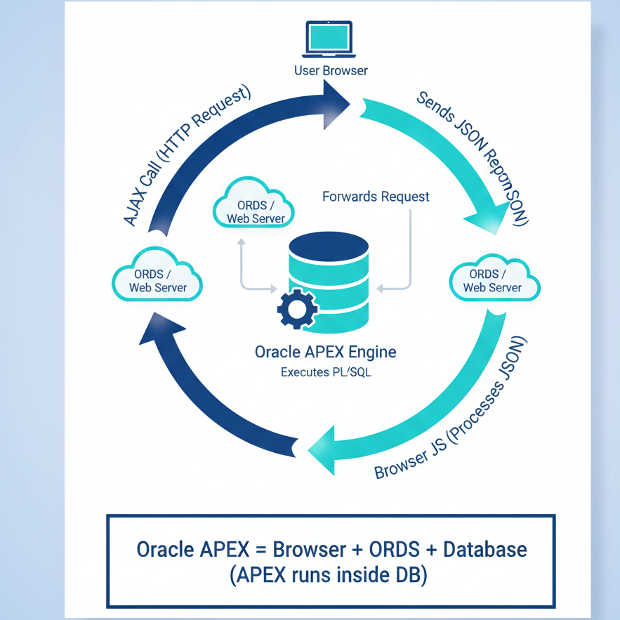 Oracle APEX (Application Express) is often described as a low-code web application development platform, but many developers—especially beginners—feel confused when they hear terms like ORDS, Web Listener, Database, Browser, and PL/SQL engine.