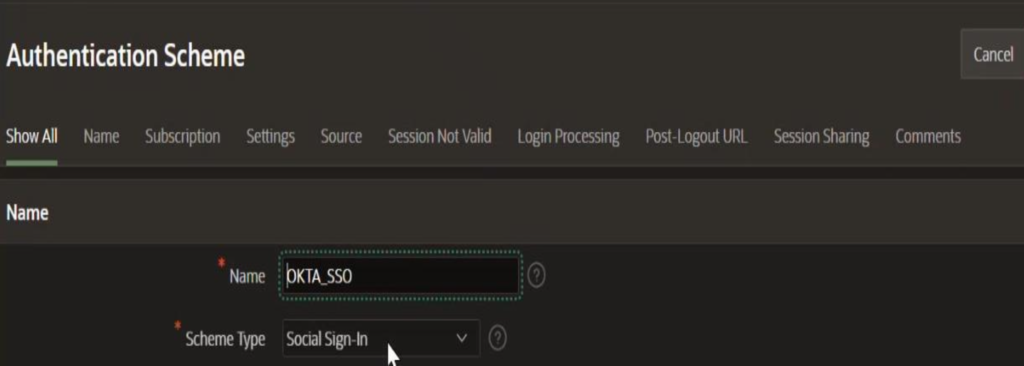 Step 15: Create new Authentication Scheme. Give the Name and Select Scheme Type as “Social Sign-In”